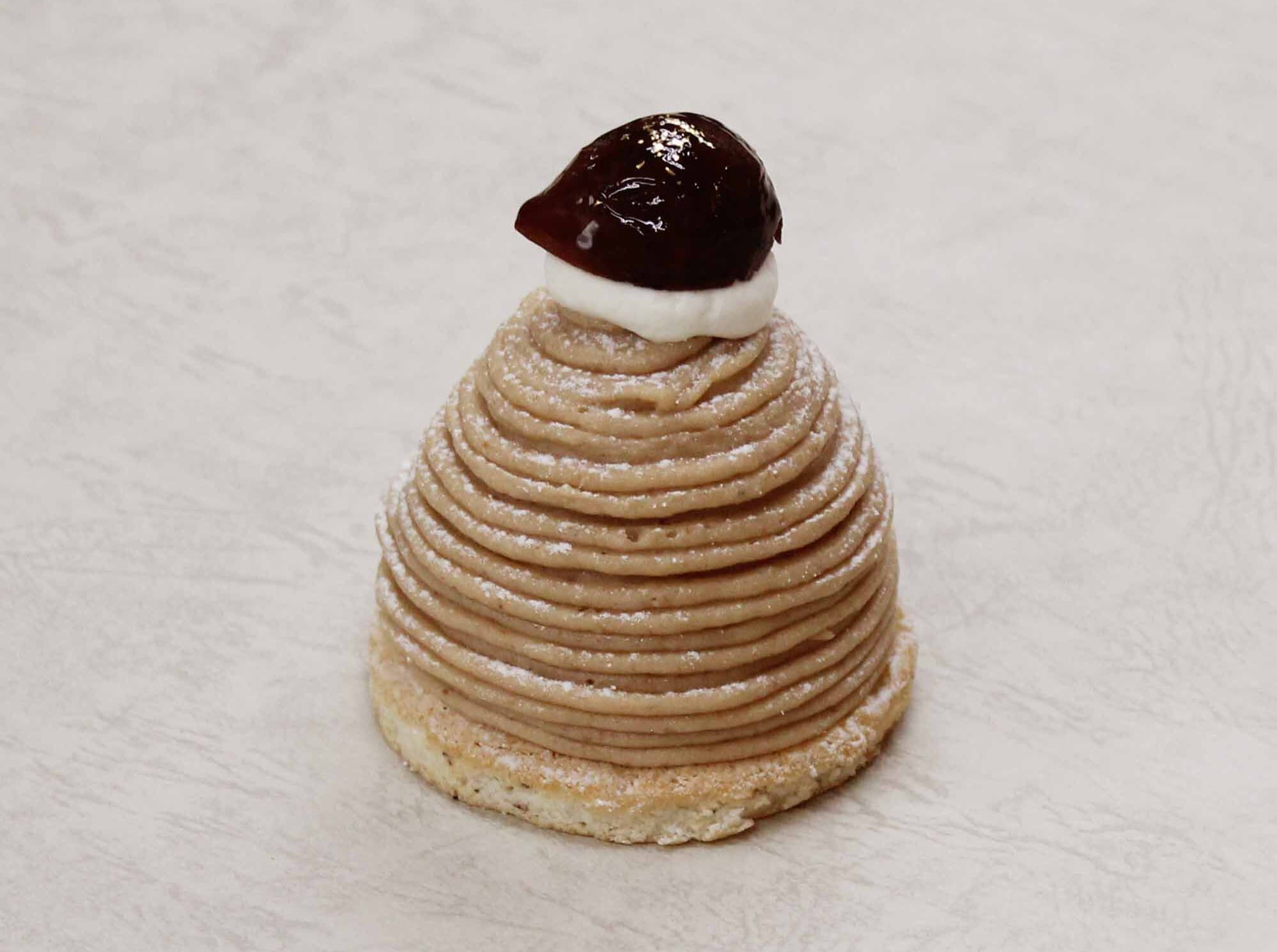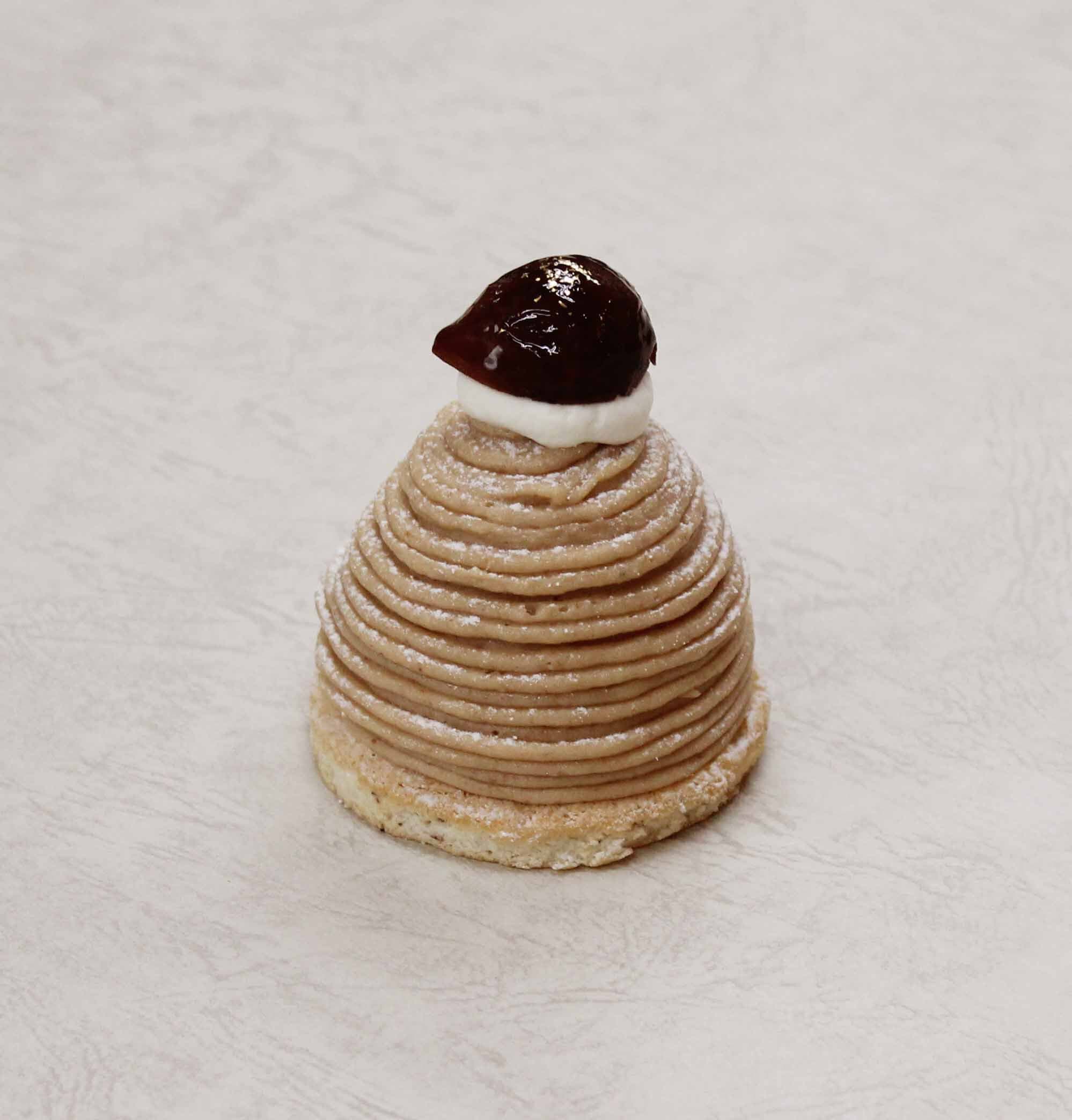 ヘーゼルナッツ風味の香ばしくコクのある生地にくるみリキュールで香りをつけたクレーム・シャンティを合わせ、艶やかなグラサージュをかけた日髙シェフの自慢の逸品です。