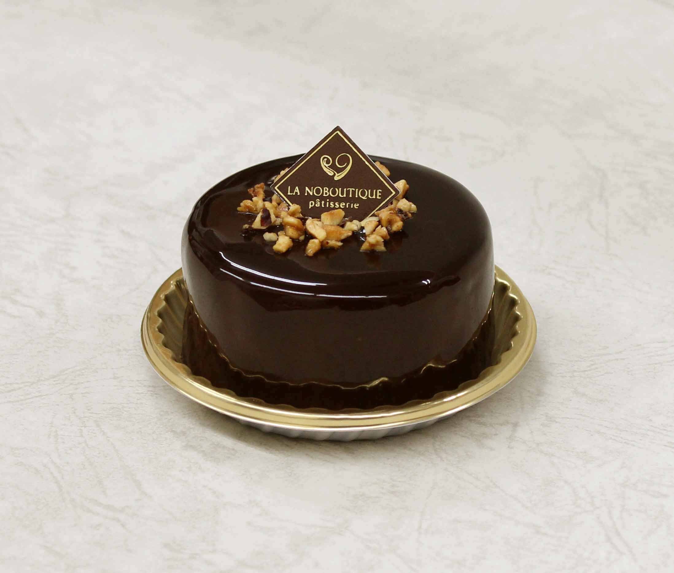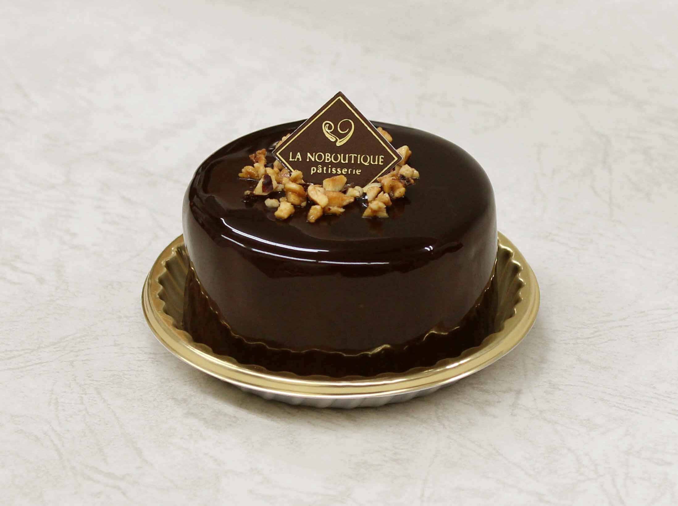 ヘーゼルナッツ風味の香ばしくコクのある生地にくるみリキュールで香りをつけたクレーム・シャンティを合わせ、艶やかなグラサージュをかけた日髙シェフの自慢の逸品です。